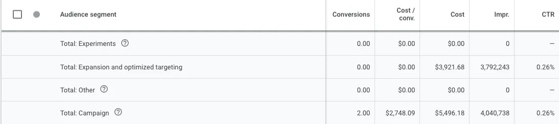 For example, Cypress North's remarketing display campaign with Optimized Targeting enabled spent $5,500, of which about 70% went to expansion and optimized targeting. In one month, zero conversions were received from the expanded audience. The CPL from optimized targeting was three times higher than from the original audience segments.