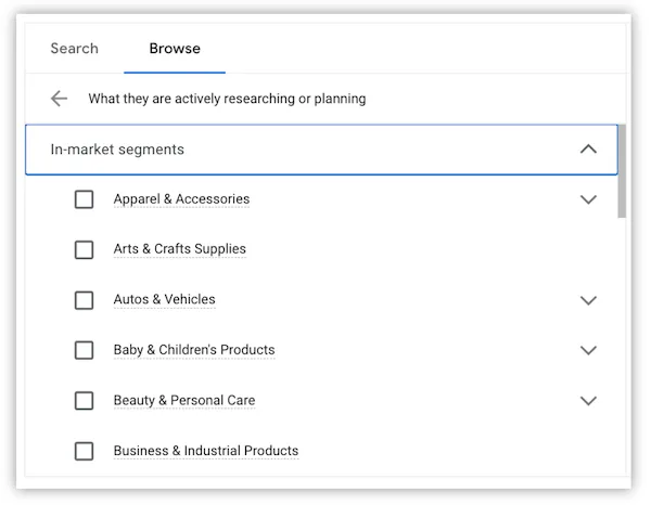 In-Market Audiences are groups of users that Google has identified as currently researching a specific category. Google analyzes search queries, visited websites, and viewed content. Based on this behavior, Google assigns users to categories indicating an active intent to buy.