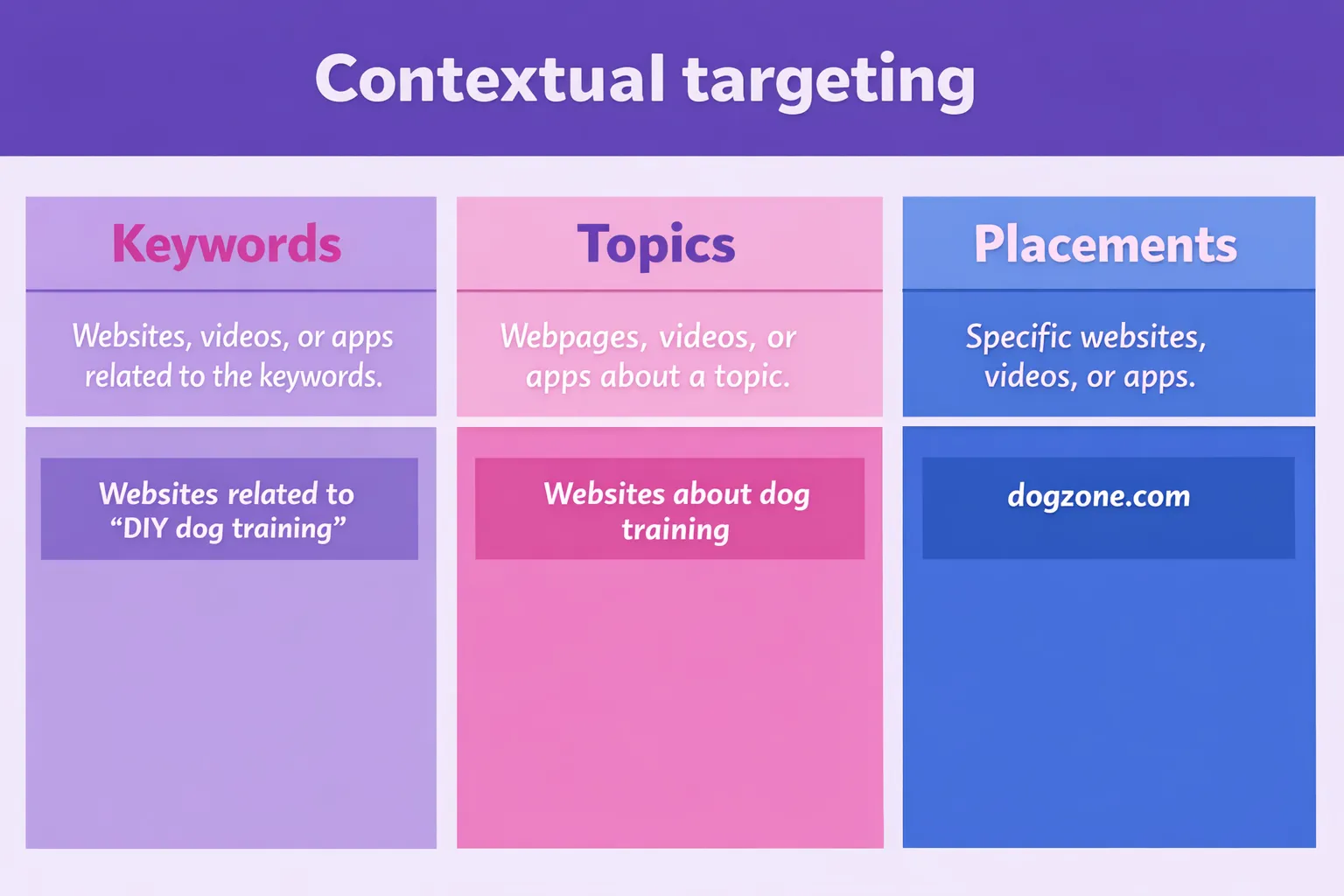 At the MOFU stage, the audience is already showing signs of active research: looking for solutions, comparing vendors, reading reviews. Here, Display helps capture demand. At this stage, the right Display advertising targeting setup has a direct impact on traffic quality. Three targeting options help with this, each with its own degree of accuracy and control.