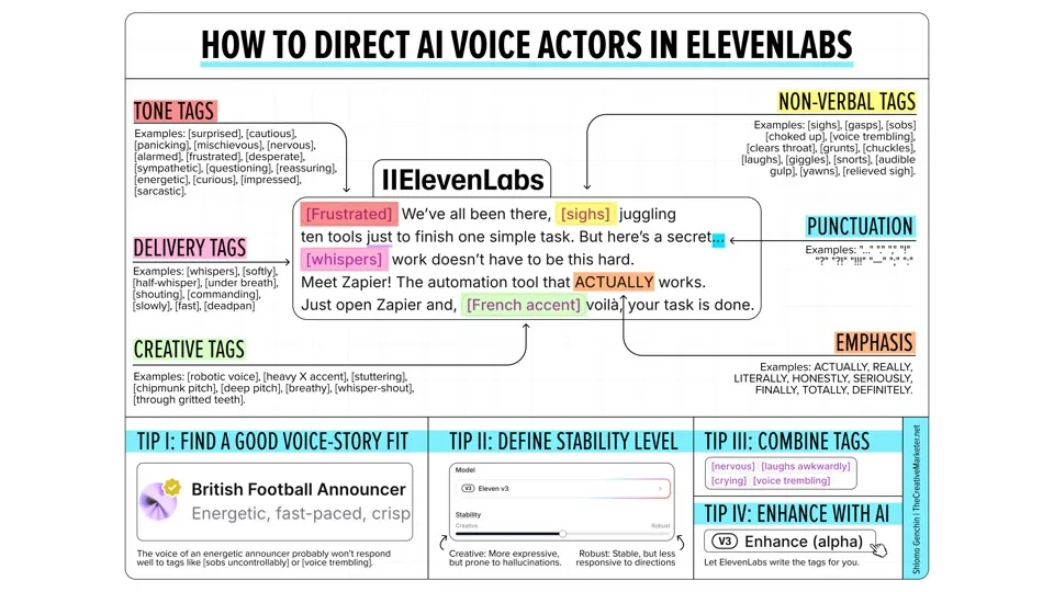 Here’s Shlomo’s quick cheat sheet for directing AI voice actors in Eleven Labs:
