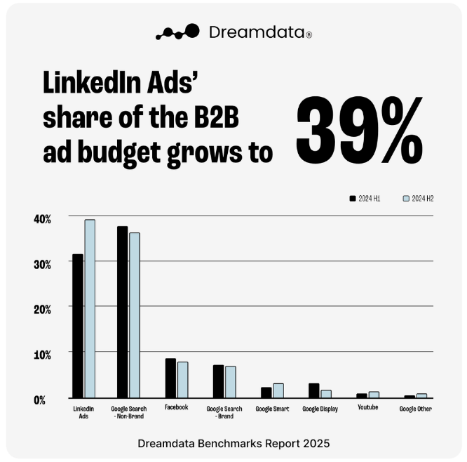 For B2B SaaS companies, this means direct access to the ideal customer profile (ICP): 65 million decision-makers, four out of five of whom are involved in business decisions within their organizations. By the end of 2025, LinkedIn accounted for 39% of all B2B paid media budgets.