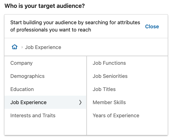 Job experience is a key category for B2B SaaS. For most campaigns, LinkedIn ads audience targeting becomes materially more useful once job-based filters are configured correctly. It includes job title, job function, job seniority, member skills, and years of experience.