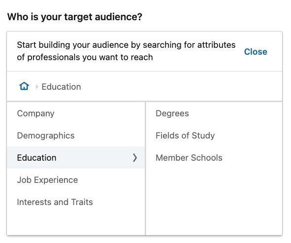 For B2B SaaS demand generation, however, this setting has little practical value. Among all LinkedIn ads audience types, education-based segments are usually some of the weakest for demand gen. In a professional context, educational background is less important than experience: a VP of Engineering with or without an MBA has the same influence on the decision to purchase SaaS.