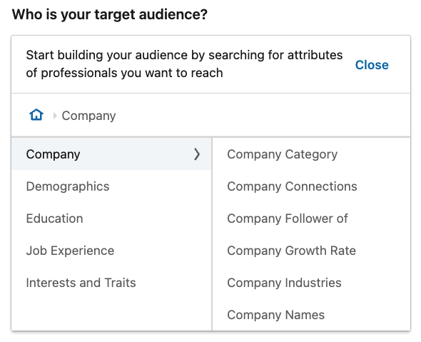 With Company List, you can upload a CSV file containing a list of target companies. LinkedIn then matches these companies against its database of over 13 million company pages and creates an audience consisting of their employees.